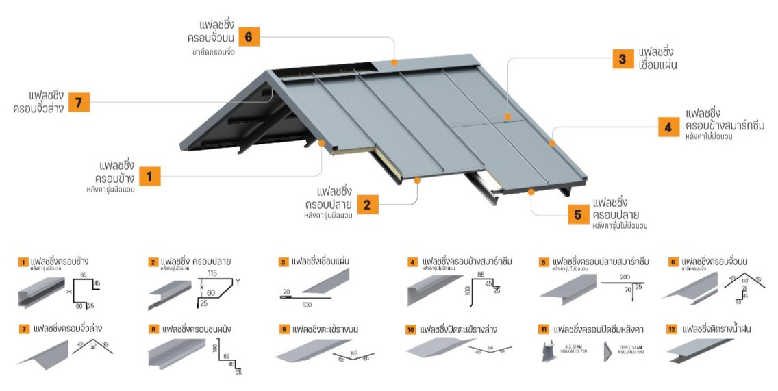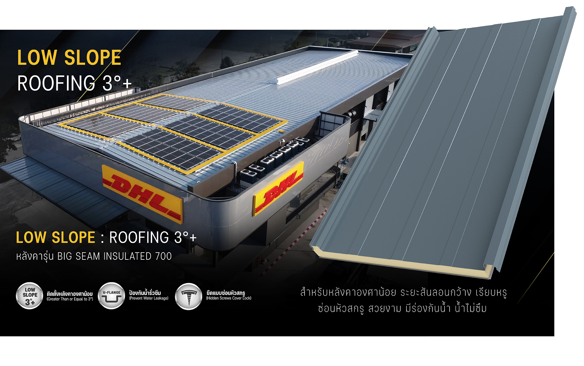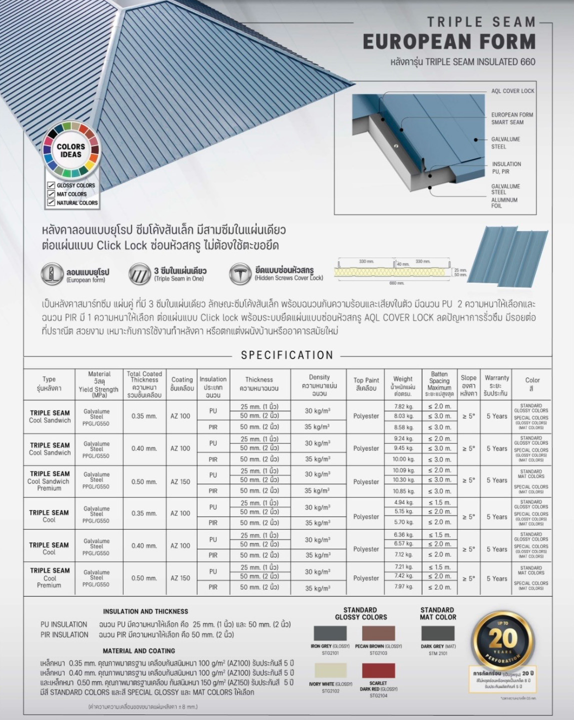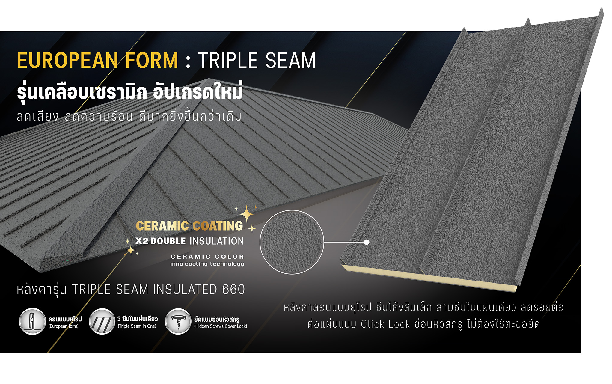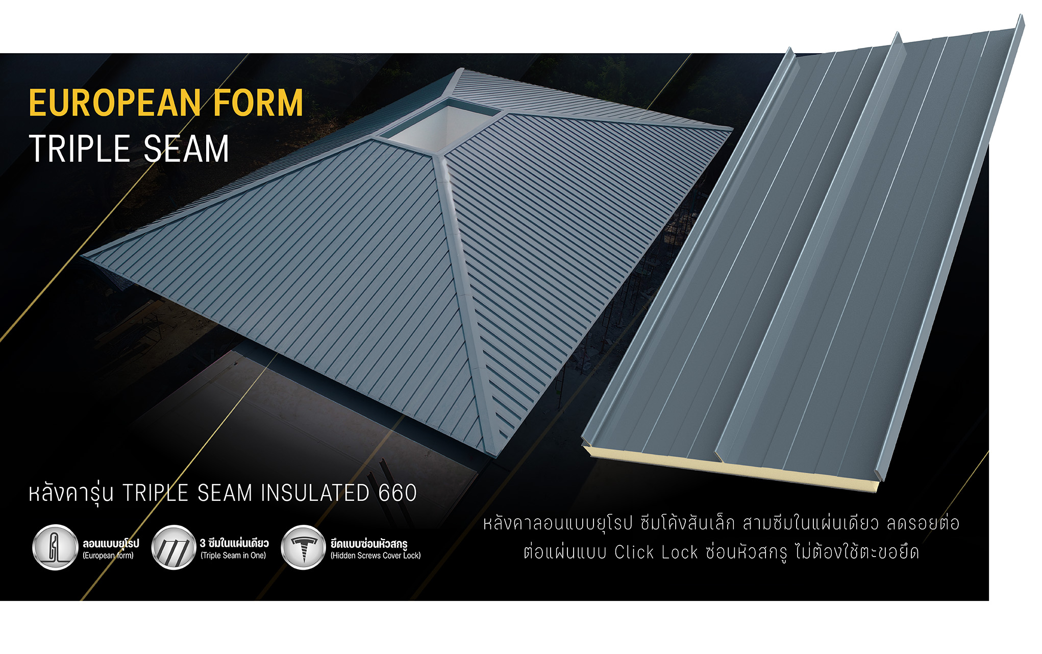 หลังคาสมาร์ทซีม แผ่นคู่ ที่มี 3 ซึมในแผ่นเดียว ลักษณะซึมโค้งสันเล็ก พร้อมฉนวนกันความร้อนและเสียงในตัว มีฉนวน PU 2 ความหนาให้เลือกและฉนวน PIR มี 1 ความหนาให้เลือก ต่อแผ่นแบบ Click lock พร้อมระบบยึดแผ่นแบบซ่อนหัวสกรู AQL COVER LOCK ลดปัญหาการรั่วซึม มีรอยต่อ ที่ปราณีต สวยงาม
